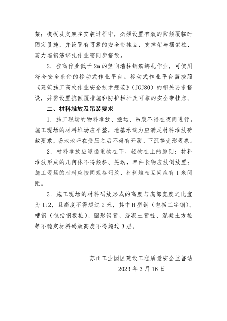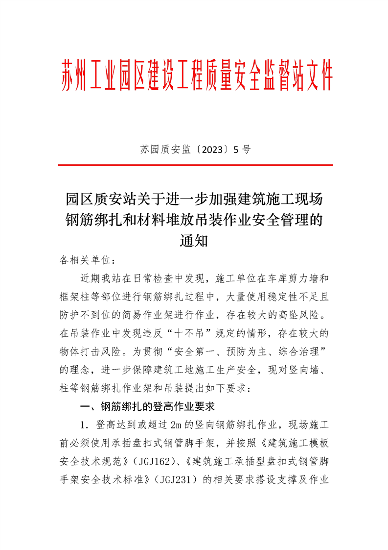 園區(qū)質(zhì)安站關(guān)于進(jìn)一步加強(qiáng)建筑施工現(xiàn)場鋼筋綁扎和材料堆放吊裝作業(yè)安全管理的通知
