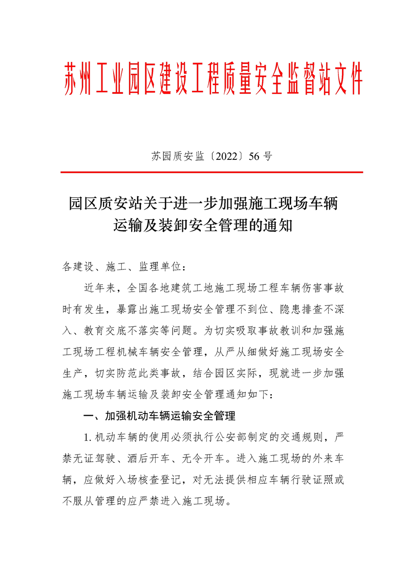 園區(qū)質(zhì)安站關(guān)于進一步加強施工現(xiàn)場車輛運輸及裝卸安全管理的通知