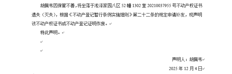 關(guān)于淞澤家園八區(qū)52幢1302室20210037955號不動產(chǎn)權(quán)證書遺失聲明