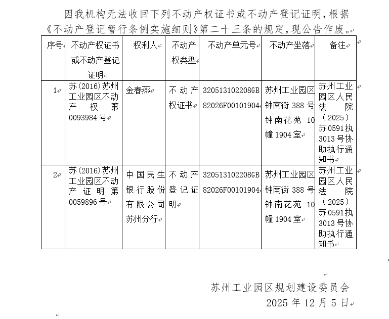 不動產權證書/登記證明作廢公告蘇園 證廢字2025(0181)號(鐘南花苑10幢1904室)