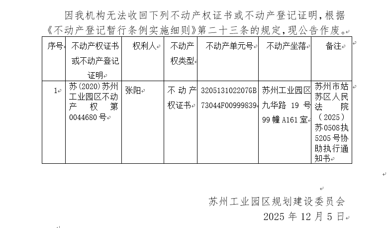不動(dòng)產(chǎn)權(quán)證書(shū)/登記證明作廢公告蘇園 證廢字2025(0188)號(hào)(蘇州工業(yè)園區(qū)九華路19號(hào)99幢A161室)
