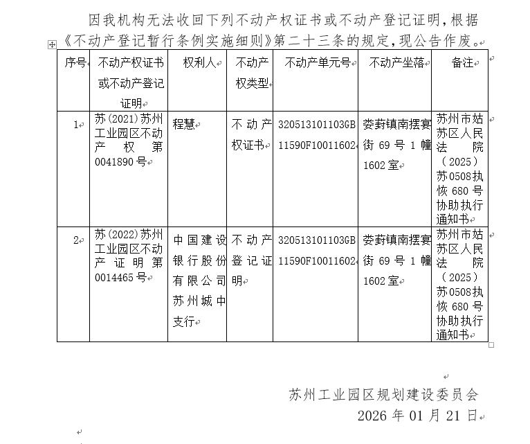 不動產(chǎn)權(quán)證書/登記證明作廢公告蘇園 證廢字2026(0013)號(婁葑鎮(zhèn)南擺宴街69號1幢1602室)