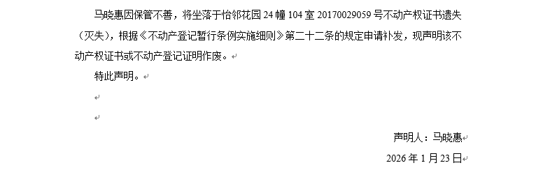 關(guān)于怡鄰花園24幢104室20170029059號不動產(chǎn)權(quán)證書遺失聲明