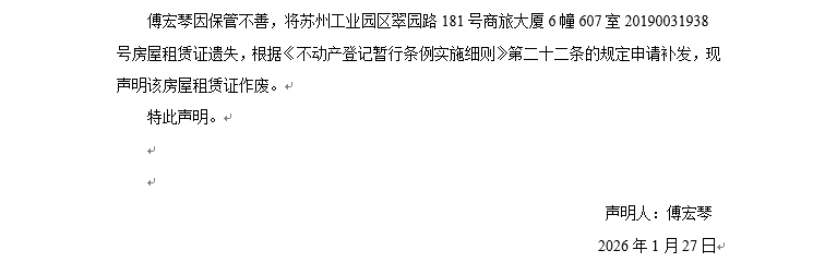 關于蘇州工業園區翠園路181號商旅大廈6幢607室20190031938號房屋租賃證遺失聲明