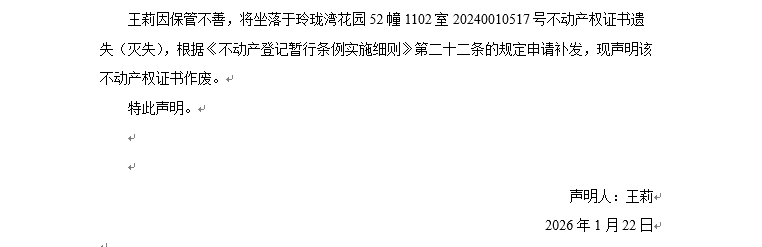 關(guān)于玲瓏灣花園52幢1102室20240010517號不動產(chǎn)權(quán)證書遺失聲明