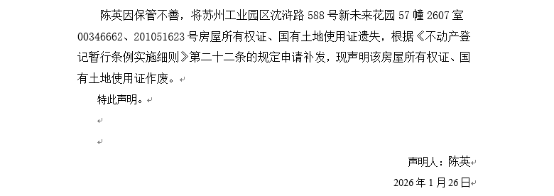 關于蘇州工業園區沈滸路588號新未來花園57幢2607室00346662、201051623號房屋所有權證、國有土地使用證遺失聲明