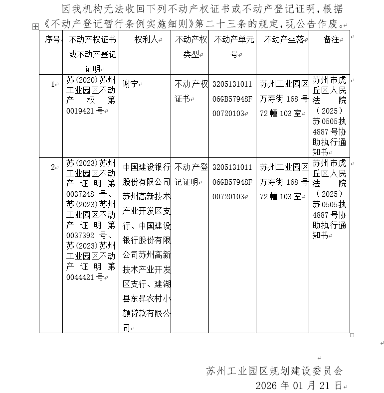 不動產權證書/登記證明作廢公告蘇園 證廢字2026(0012)號(蘇州工業園區萬壽街168號72幢103室)