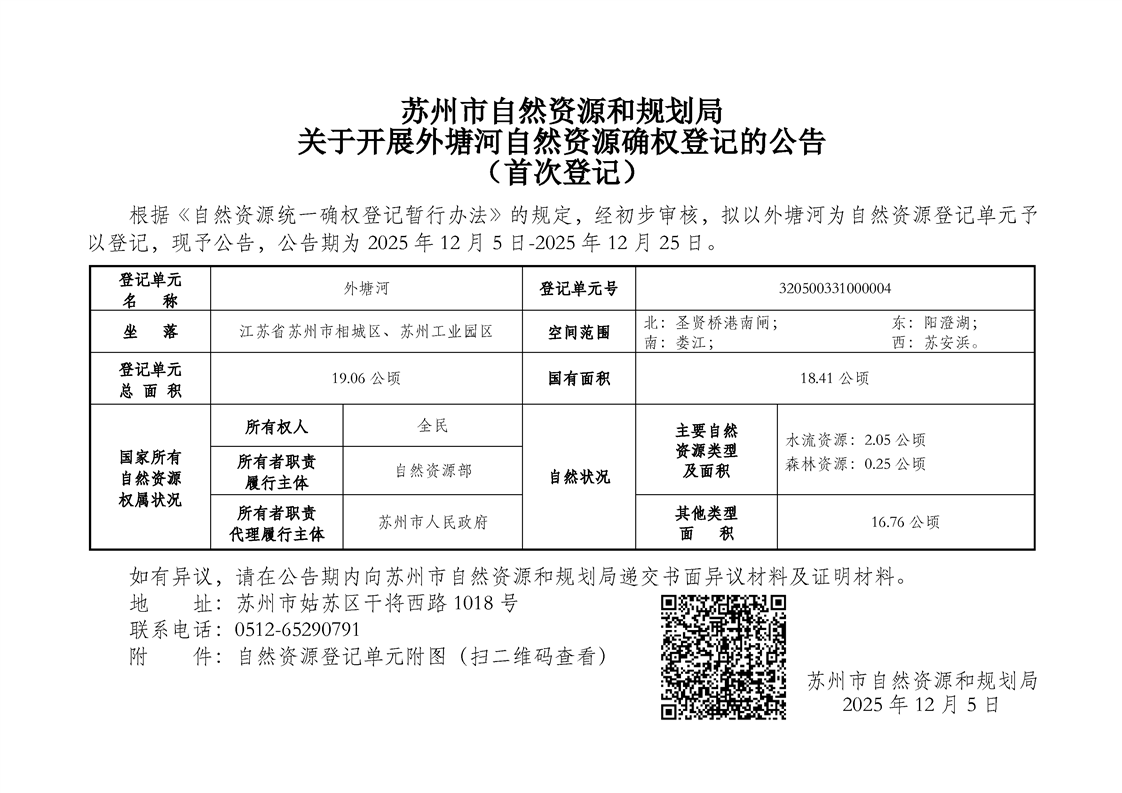 蘇州市自然資源和規(guī)劃局關(guān)于開(kāi)展外塘河自然資源確權(quán)登記的公告(首次登記)