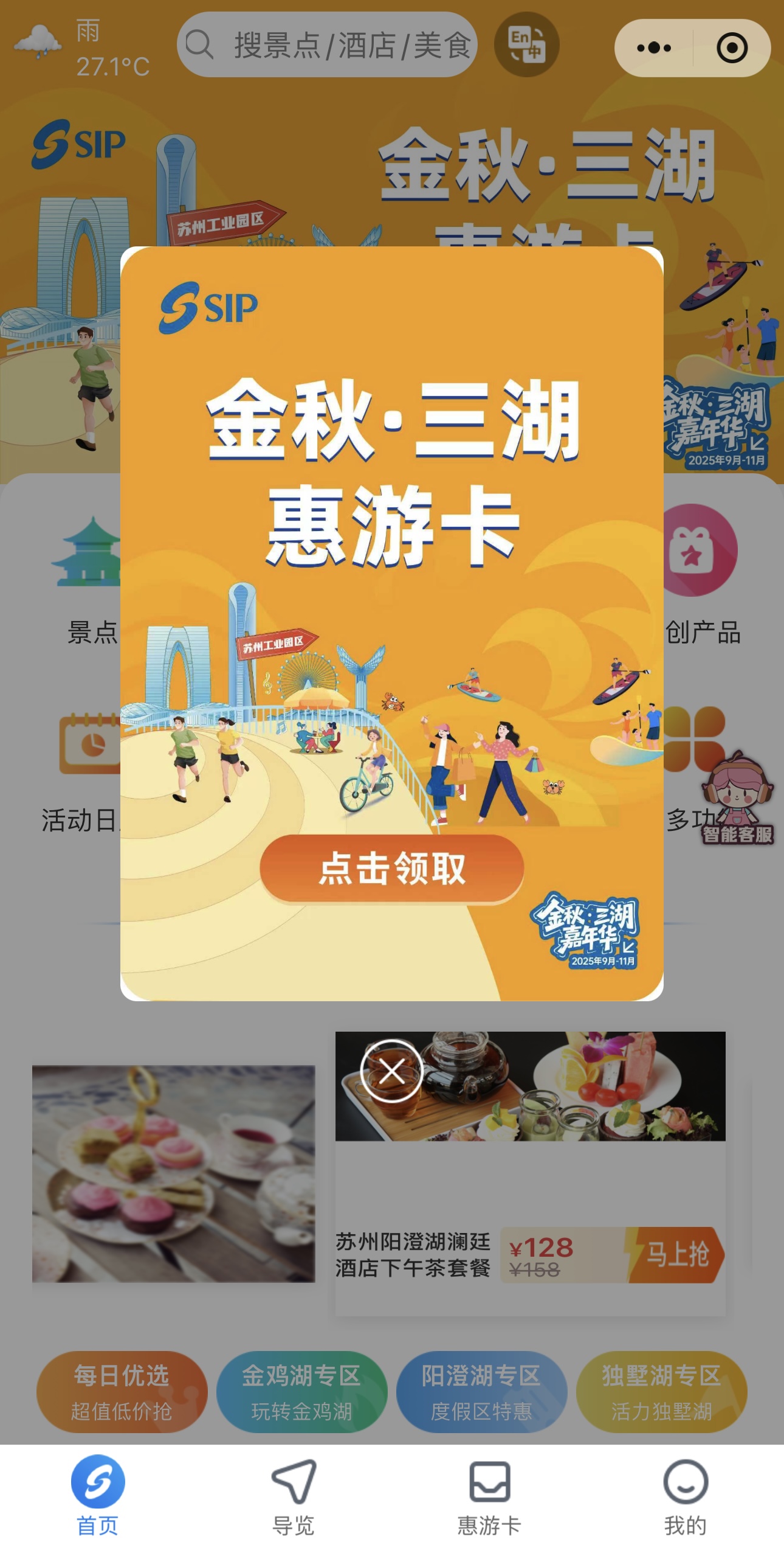 9至11月,W酒店、凱悅、尼依格羅等18家園區酒店推出低于8折的特惠套餐,涵蓋帶寵出游、情侶約會、下午茶、時令品鮮等多元場景;蘇州之眼摩天輪、金雞湖游船、運動手作體驗等園區特色文商旅體驗產品同步推出6折券,最高立減300元,大幅降低文旅體驗成本。