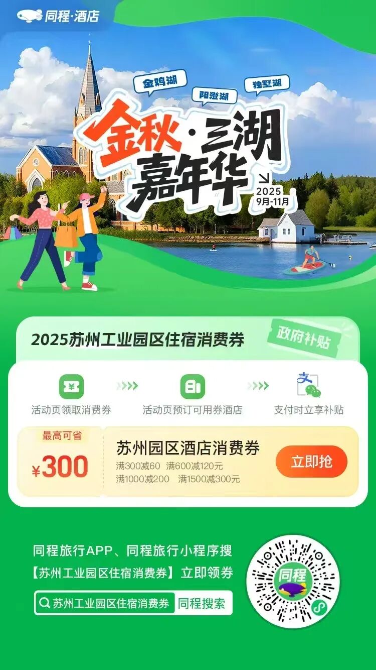在住宿文旅領域,園區聯合同程旅行平臺發放百萬級住宿消費紅包,市民游客登錄同程旅行APP或小程序,搜索“金秋?三湖嘉年華”進入專題頁面即可一鍵領取住宿文旅消費券,在活動頁預訂可用券酒店,支付時立享補貼,最高可減300元。