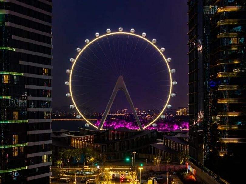 傍晚時分,金雞湖迎來一天中最美的時刻。“蘇州之眼”摩天輪的黃昏場格外浪漫,夕陽為太空艙鍍上金邊,湖面倒映著橙紅色霞光。不遠處的蘇州文化藝術中心、688藝術潮流空間匯聚了各類藝術展覽與潮流活動,在這里能深刻感受園區的藝術脈搏。當夜幕降臨,月光碼頭燈火璀璨,湖邊酒吧傳來輕柔音樂,是漫步賞景的理想去處。環金雞湖周邊不同風格的酒店則提供了多元住宿選擇,既能享受便捷交通,更能近距離領略金雞湖的迷人夜色。