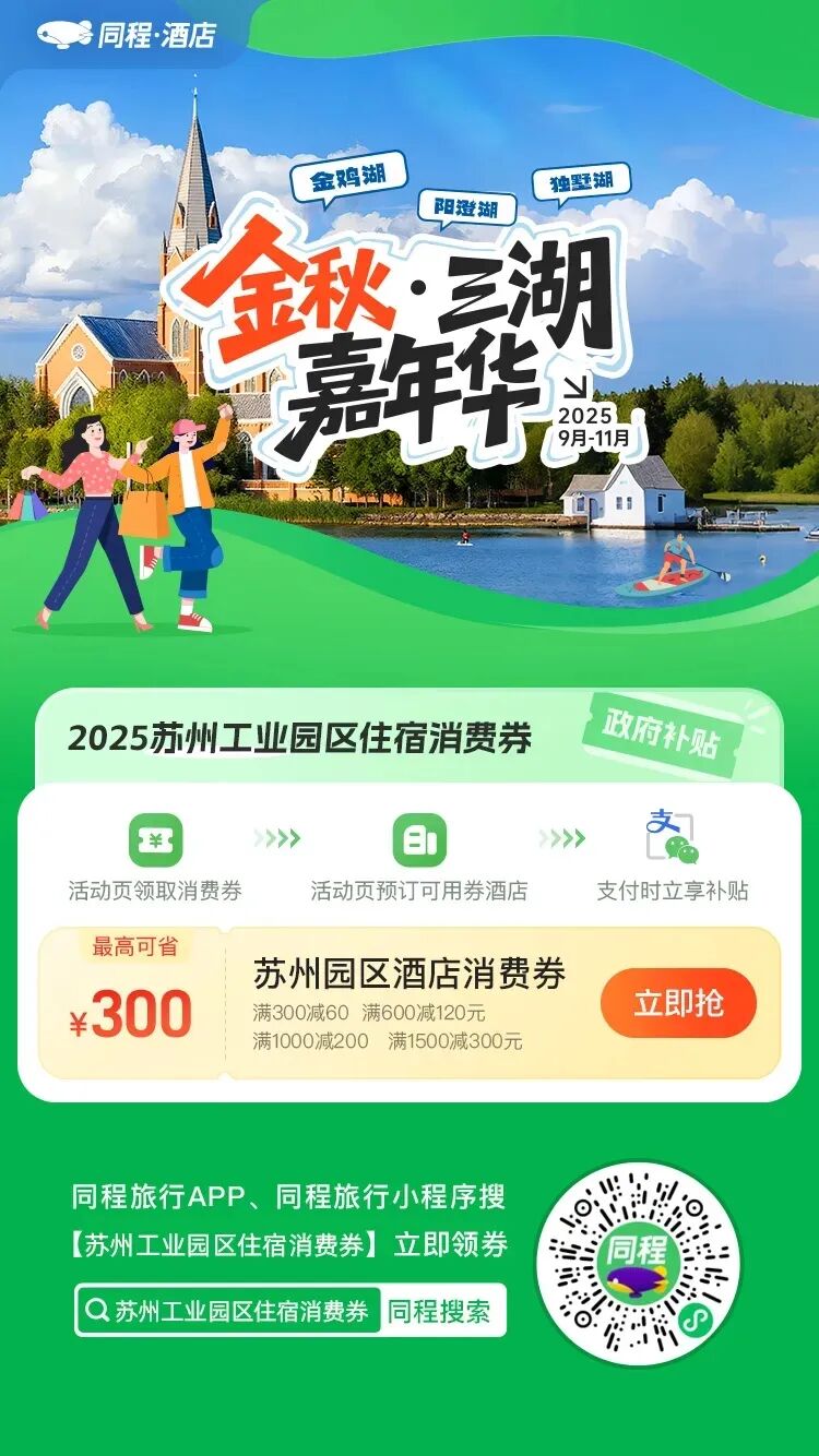 為讓宿游體驗更添實惠,園區特別聯合同程旅行平臺發放百萬級住宿消費紅包。市民游客登錄同程旅行APP或小程序,搜索“金秋?三湖嘉年華”進入專題頁面,即可一鍵領取住宿文旅消費券,預定活動酒店支付時立享補貼,最高立減300元。