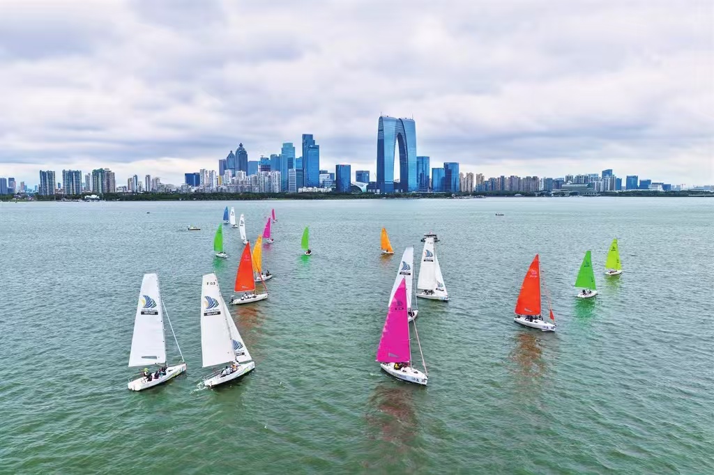 昨天,第十六屆“城際內(nèi)湖杯”金雞湖帆船賽激烈進(jìn)行中,湖上片片彩帆點綴,各參賽隊趁風(fēng)揚帆。