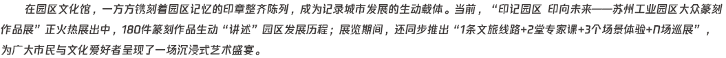 「印記園區(qū)印向未來(lái)」蘇州工業(yè)園區(qū)大眾篆刻作品展持續(xù)熱展中。傳統(tǒng)印面·對(duì)話當(dāng)代地標(biāo),歷史印記·融合未來(lái)表達(dá),多維創(chuàng)作·科技賦能,十余種創(chuàng)新治印... [詳細(xì)]