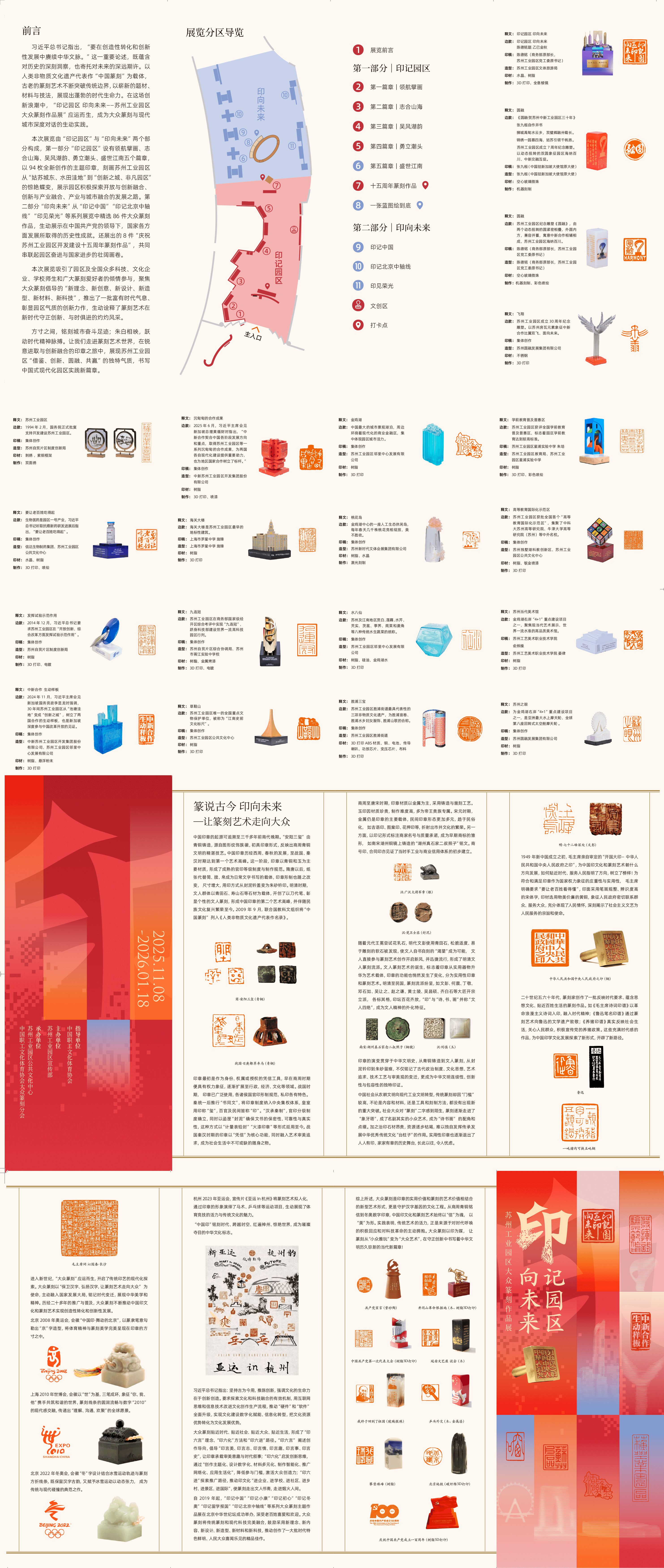 當(dāng)傳統(tǒng)篆刻技藝與現(xiàn)代科技相遇,當(dāng)印石藝術(shù)記錄城市發(fā)展年輪,一場(chǎng)跨越時(shí)空的藝術(shù)對(duì)話正在上演。2025年11月8日至2026年1月18日,“印記園區(qū) 印向未來(lái)”蘇州工業(yè)園區(qū)大眾篆刻作品展正式在園區(qū)文化館拉開(kāi)帷幕,展覽精選180枚篆刻佳作,以方寸之間的藝術(shù)語(yǔ)言,生動(dòng)展現(xiàn)園區(qū)發(fā)展歷程、創(chuàng)新精神與文化底蘊(yùn),為“金秋·三湖嘉年華”增添獨(dú)特的藝術(shù)魅力。展品精良,深植園區(qū)文化基因展覽以“印記園區(qū)”“印向未來(lái)”兩大板塊構(gòu)建完整敘事脈絡(luò),不僅彰顯了專業(yè)的藝術(shù)水準(zhǔn),更深度融合園區(qū)特質(zhì),讓篆刻藝術(shù)與園區(qū)發(fā)展、城市記憶深度交融。在“印記園區(qū)”部分,94枚全新創(chuàng)作的印章形成“領(lǐng)航擘畫”“志合山海”“吳風(fēng)湖韻”“勇立潮頭”“盛世江南”五大篇章,立體勾勒了園區(qū)的驚艷蝶變。其中,《發(fā)揮試驗(yàn)示范作用》印章以DNA雙螺旋結(jié)構(gòu)象征生物醫(yī)藥、芯片造型... [詳細(xì)]