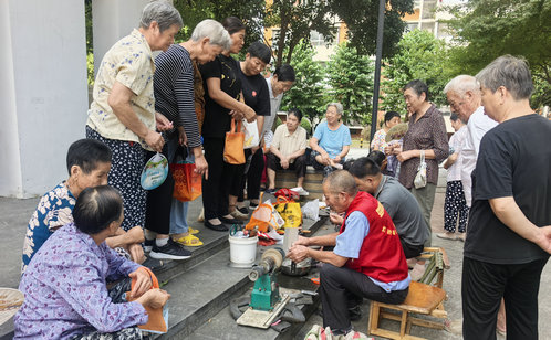 與此同時(shí),同星園廣場(chǎng)上熱鬧非凡,一場(chǎng)結(jié)合便民服務(wù)與趣味游園的創(chuàng)意活動(dòng)在此開展。便民服務(wù)區(qū)內(nèi)匯聚了健康咨詢、理發(fā)修甲、磨刀、智能AI宣傳、套圈等多元化項(xiàng)目,網(wǎng)格員和志愿者引導(dǎo)居民有序參與,并耐心為老人測(cè)量血壓,提供個(gè)性化健康指導(dǎo)。游園活動(dòng)區(qū)內(nèi)人頭攢動(dòng),投壺競(jìng)技、果蔬套圈、“好運(yùn)滾滾來”等游戲項(xiàng)目前吸引了不少老年居民圍觀參與。“紅管”志愿者用通俗易懂的語(yǔ)言講解游戲規(guī)則,協(xié)助老人游玩,現(xiàn)場(chǎng)笑聲不斷,讓老年居民在輕松愉悅的氛圍中感受社區(qū)的貼心關(guān)懷。