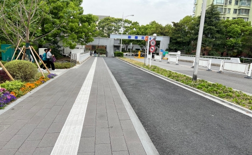 在明確改造方向后,社區(qū)黨委聯(lián)合市政部門、專業(yè)團(tuán)隊(duì)開(kāi)展技術(shù)論證,邀請(qǐng)黨員、居民代表、物業(yè)公司共同參與。針對(duì)北門人車混行的問(wèn)題,實(shí)行行人和非機(jī)動(dòng)車分流,人行道采用防滑PC磚,非機(jī)動(dòng)車道鋪設(shè)瀝青路面,同步增設(shè)盲道,保障各類群體通行安全與便利。方案還注重融入社區(qū)人文元素,在通道側(cè)設(shè)置“小區(qū)暖心地圖”,方便進(jìn)入小區(qū)的訪客、快遞員等快速定位樓棟,使通道在通行功能之外,也成為社區(qū)文化的展示窗口。