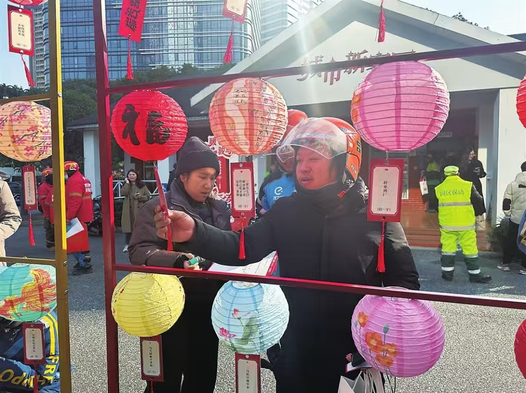 現(xiàn)場,拍照打卡、臘八粥領(lǐng)取、燈謎互動、國家安全宣傳、關(guān)愛服務(wù)、關(guān)愛反饋和免費剪發(fā)等暖“新”服務(wù)區(qū),讓新就業(yè)群體在現(xiàn)場感受到濃濃的節(jié)日氛圍。近200條五彩的燈謎隨風輕擺,宛如一串串節(jié)日彩旗,在冬日的陽光下閃爍著溫暖的光芒。這些燈謎不僅融入了臘八節(jié)的傳統(tǒng)元素,還包含了國家安全相關(guān)知識的宣傳,為快遞小哥、外賣騎手以及環(huán)衛(wèi)工人等參與者帶來了一場別開生面的文化體驗。大家端詳沉思,待心中有了謎底,就紛紛揭下謎面,感受猜謎帶來的歡樂。與以往不同,此次活動還加入了需求調(diào)研環(huán)節(jié),新就業(yè)群體積極掃描二維碼填寫問卷,分享工作生活中的實際需求。