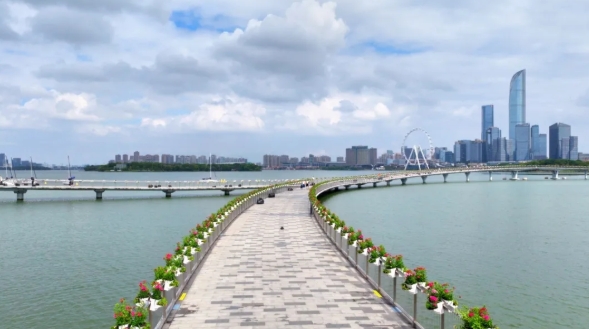 同時,在園區主干道、景觀棧橋等重點公共空間有序開展花卉布置,依托簡潔、大氣的塊狀與環狀設計語言,強化視覺秩序和節日儀式感。以紫、玫紅、黃等暖色調形成連續、飽滿的色帶效果,有效烘托熱烈祥和、團結喜慶的節日氛圍。